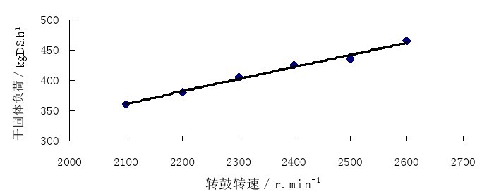 所謂干固體負(fù)荷是指每小時(shí)處理的不揮發(fā)固體重量,以 KgDS(干污泥)/h 表示。調(diào)整離心機(jī)的干固體負(fù)荷,對(duì)污泥脫水效果有很大影響,當(dāng)進(jìn)泥流量(即“水力負(fù)荷”)達(dá)到一定程度,所帶入的懸浮物含量超過(guò)了離心機(jī)所能承受的最大干固體負(fù)荷時(shí),會(huì)造成泥餅含水率增加,上清液帶泥增多,此時(shí)應(yīng)該減少進(jìn)泥流量,使離心機(jī)脫出的上清液清澈在實(shí)際運(yùn)行中,必須通過(guò)調(diào)整水力負(fù)荷,來(lái)保證進(jìn)入離心機(jī)干固體負(fù)荷不超過(guò)離心機(jī)的最大承受能力,否則,多余的干固體將從上清液中排出,上清液的懸浮物會(huì)急劇增多,但脫水泥餅的產(chǎn)量并沒(méi)有增加。該廠使用的離心機(jī),當(dāng)轉(zhuǎn)鼓轉(zhuǎn)速為 2300rpm、進(jìn)泥濃度為 35 g/L 時(shí),離心機(jī)運(yùn)行的干固體負(fù)荷可達(dá) 405kg/h。當(dāng)離心機(jī)磚鼓轉(zhuǎn)速增加時(shí),干固體負(fù)荷也會(huì)相應(yīng)增加,圖 3 是最大干固體負(fù)荷隨離心機(jī)轉(zhuǎn)鼓轉(zhuǎn)速變化的曲線。