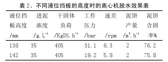 (6) 通過(guò)改變液位擋板的位置來(lái)調(diào)整離心機(jī)的液環(huán)層厚度,對(duì)離心機(jī)污泥脫水效果的影響非常大,必須通過(guò)反復(fù)的試驗(yàn),將液環(huán)層厚度設(shè)定在合適的水平,則可以保證污泥的含水率會(huì)降低,并且有較高的污泥產(chǎn)量;