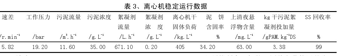具體操作時(shí),初始階段,按每公斤干污泥投加 6克 PAM 的投藥量,在保持絮凝劑投加量固定不變的前提下,通過(guò)調(diào)整污泥螺桿泵的轉(zhuǎn)速,按最大流量進(jìn)泥,從低到高逐漸提高速差,直至上清也完全清澈,如果速差已經(jīng)提高到 7 r/min 以上,上清液的懸浮物含量仍然較多,說(shuō)明進(jìn)泥量已超過(guò)離心機(jī)的最大干固體負(fù)荷,此時(shí)按 100%、90%、80%、70%、60%、50%、40%的梯度逐漸降低進(jìn)泥流量,直到出現(xiàn)良好的上清夜;經(jīng)過(guò)上述調(diào)整,待離心機(jī)運(yùn)行穩(wěn)定后,逐漸降低絮凝劑的投加量,直至在最少的 PAM 的投藥量情況下,都能獲得良好的泥餅含固率和上清液含固率為止。離心機(jī)穩(wěn)定運(yùn)行時(shí)的數(shù)據(jù)見(jiàn)表 3。