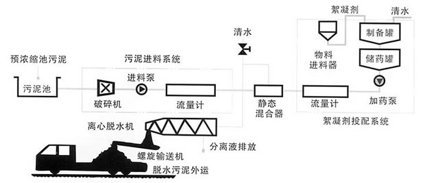 我公司制造的污泥脫水成套設(shè)備的工藝流程圖如下(主要由六大部分組成):
